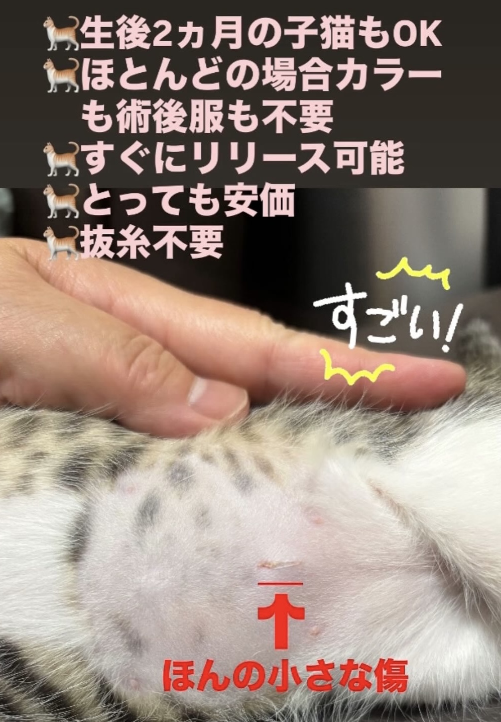 モバイルスペイは、子猫でも手術が可能で、1日で30匹以上もの件数か可能で、素晴らしい医療技術で猫への負担が最小限です。