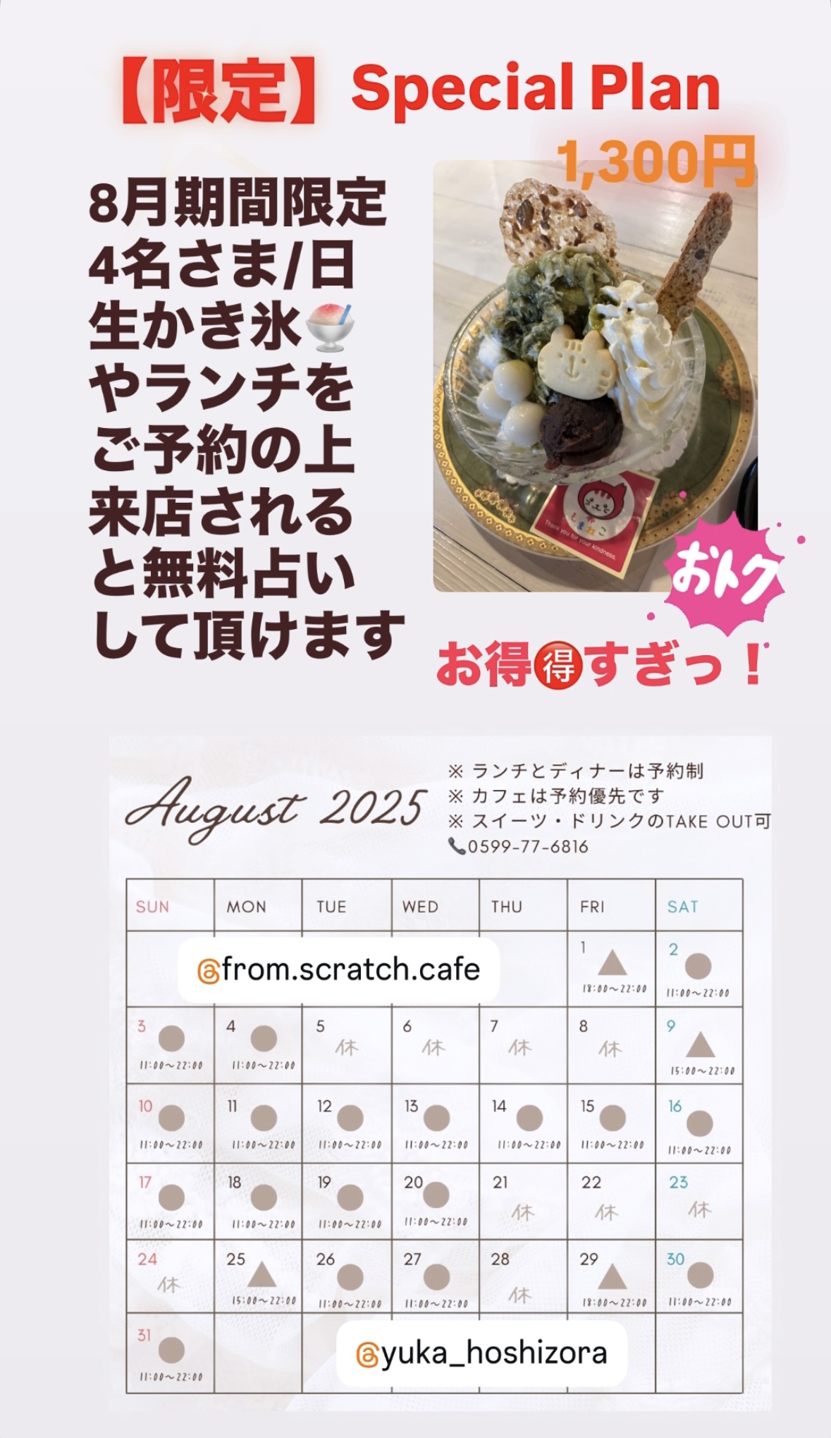 #fromscratchcafe さんでは2025.8期間限定!生かき氷やランチのご予約で4名さま限定の占い体験ができます🔮ぜひ「生かき氷(抹茶のしまねこコラボ)」を食べてください🍧