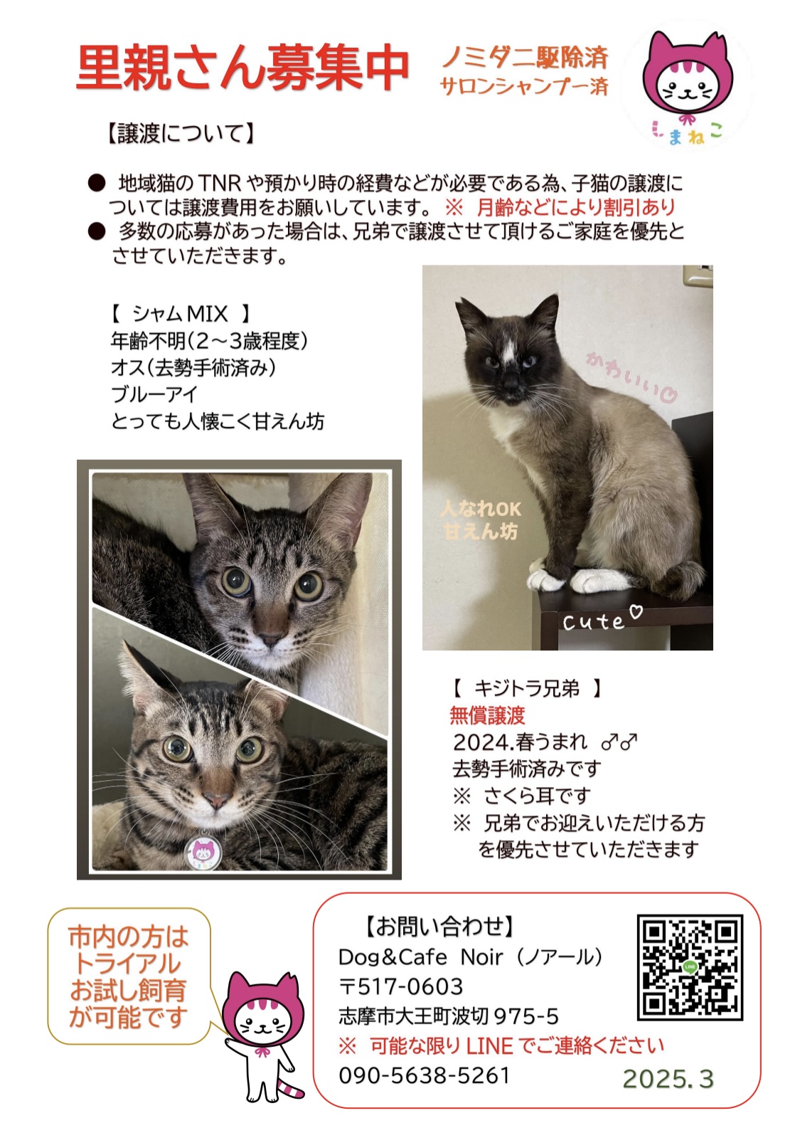 保護猫をお迎えしたい…というかた、ご紹介頂けるかたは、ノアールのLINEまでメッセージをお願いします。